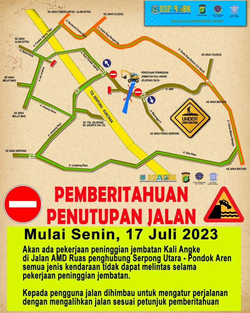 SETU, Sundapost.co.id – Ruas Jalan AMD di perbatasan Kecamatan Serpong Utara-Kecamatan Pondok Aren mulai 17 Juli 2023 akan ditutup total hingga 31 Oktober 2023. Hal ini dilakukan karena akan ada pekerjaan peninggian abutment jembatan yang melewati Kali Angke.