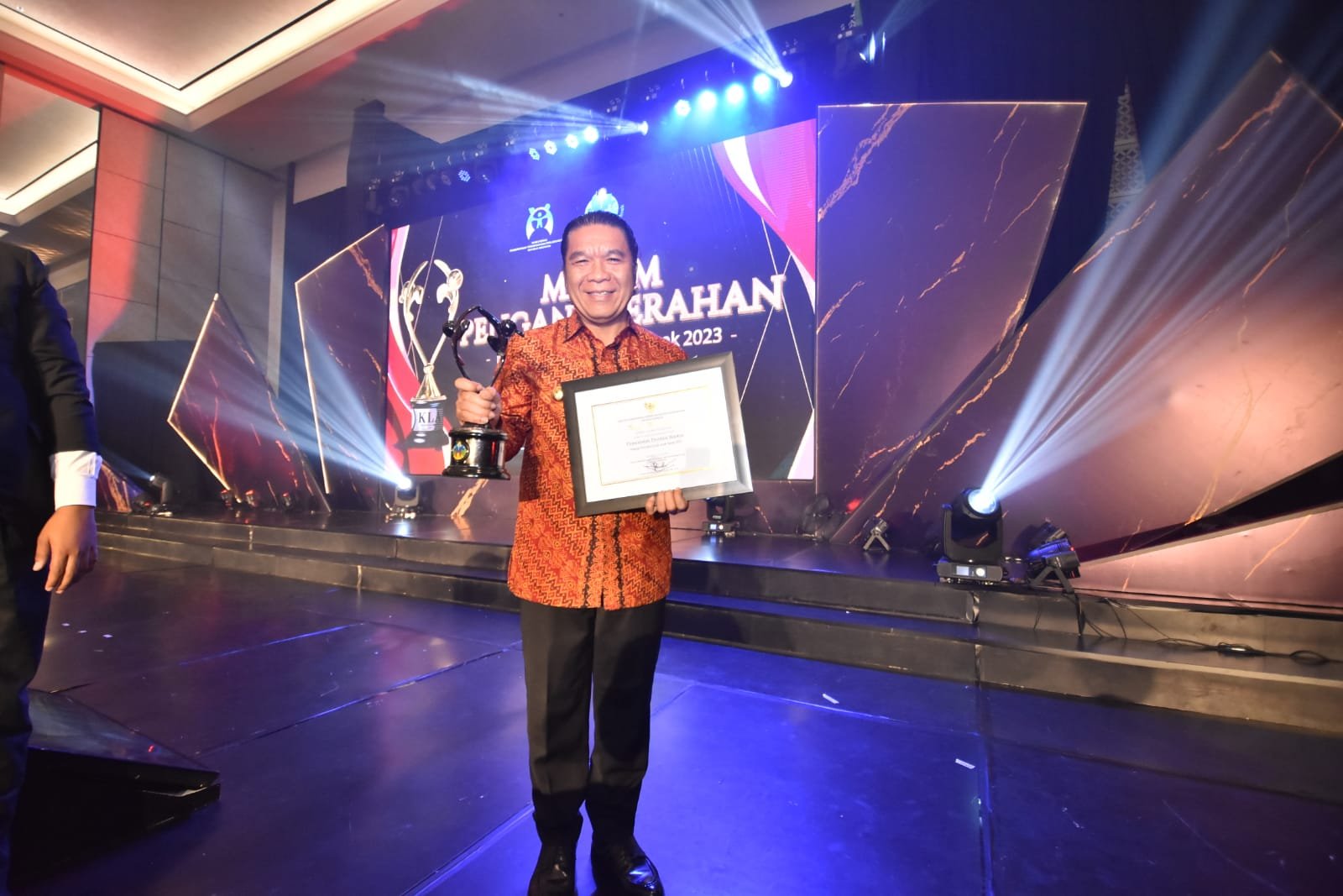 Penghargaan diterima oleh Penjabat (Pj) Gubernur Banten Al Muktabar dari Menteri Pemberdayaan Perempuan dan Perlindungan Anak (PPPA) Bintang Puspayoga pada Malam Anugerah Kabupaten/Kota Layak Anak 2023 di Hotel Padma, Semarang, Sabtu (22/7/2023) malam.