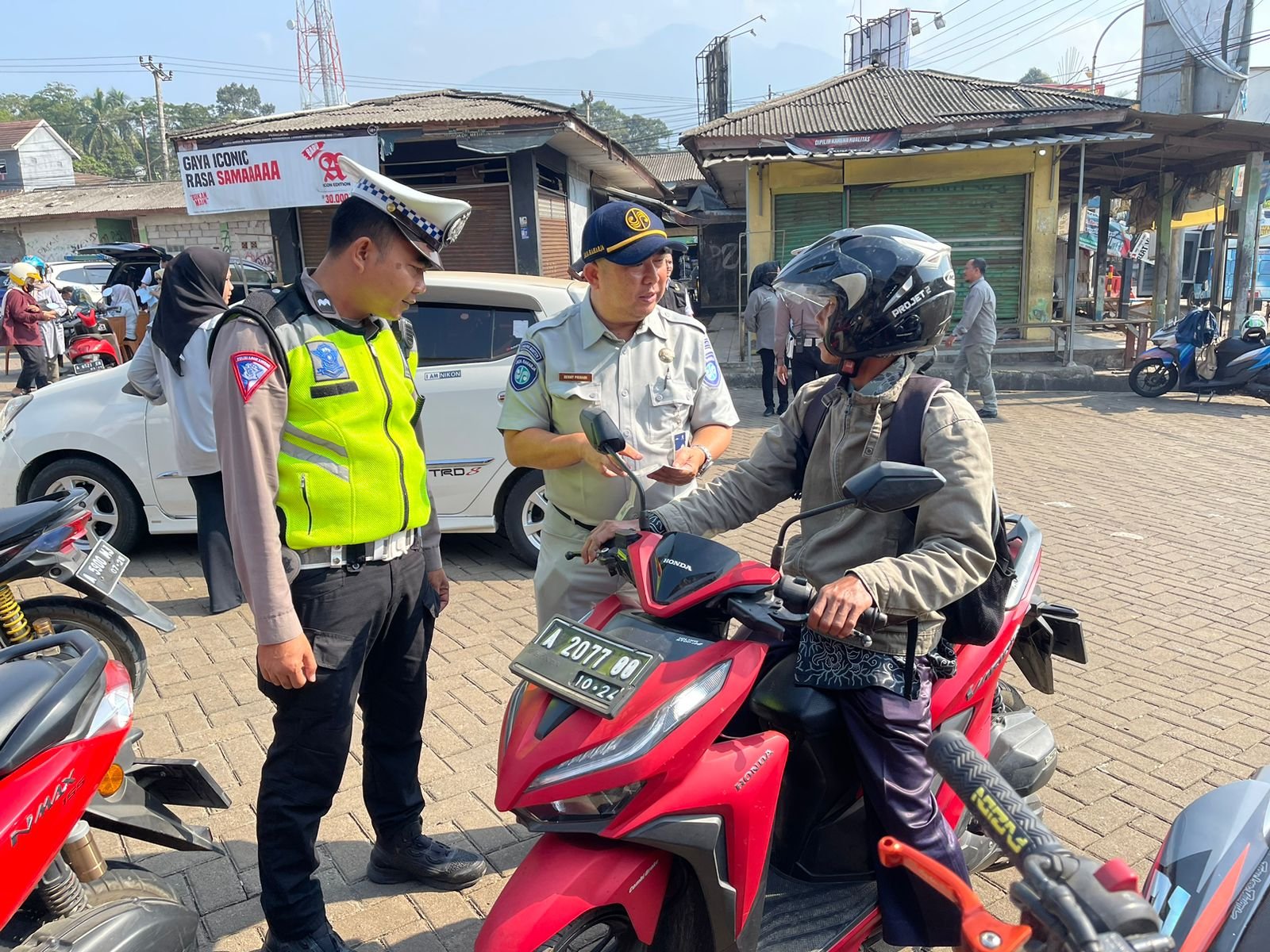 Pandeglang – Petugas Jasa Raharja Samsat Saketi Denny Pribadi turut serta dalam melakukan giat penertiban gabungan pajak kendaraan bermotor bersama tim Pembina Samsat Pandeglang pada hari rabu 06/09/2023 di terminal mengger Kabupaten Pandeglang, ini sebagai salah satu upaya untuk peningkatan kepatuhan masyarakat dan mengurangi tunggakan dalam pembayaran Pajak Kendaraan Bermotor (PKB) dan Sumbangan Wajib Dana Kecelakaan Lalu Lintas (SWDKLLJ), serta melakukan sosialisasi UU no 22 tahun 2009 Pasal 74 tentang penghapusan data kendaraan bermotor dari daftar registrasi dan identifikasi kendaraan bermotor apabila tidak melakukan pembayaran pajak setelah 2 tahun STNK mati. Dalam kesempatan ini juga turut dilakukan sosialisasi mengenai program bebas denda PKB dan bebas biaya BBNKB yang sedang berlaku di Propinsi Banten.