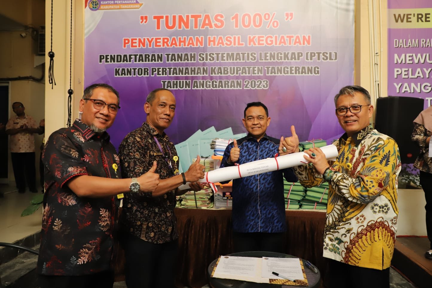 “Hari ini kita akan dilakukan penyerahan hasil dari Ketua Tim Ajudikasi PTSL 2023, Saudara Wendi Suparto kepada kepala kantor pertanahan disaksikan oleh Kakanwil BPN Banten,” ujar Kepala Kantor Pertanahan Kabupaten Tangerang, Joko Susanto dalam sambutannya.