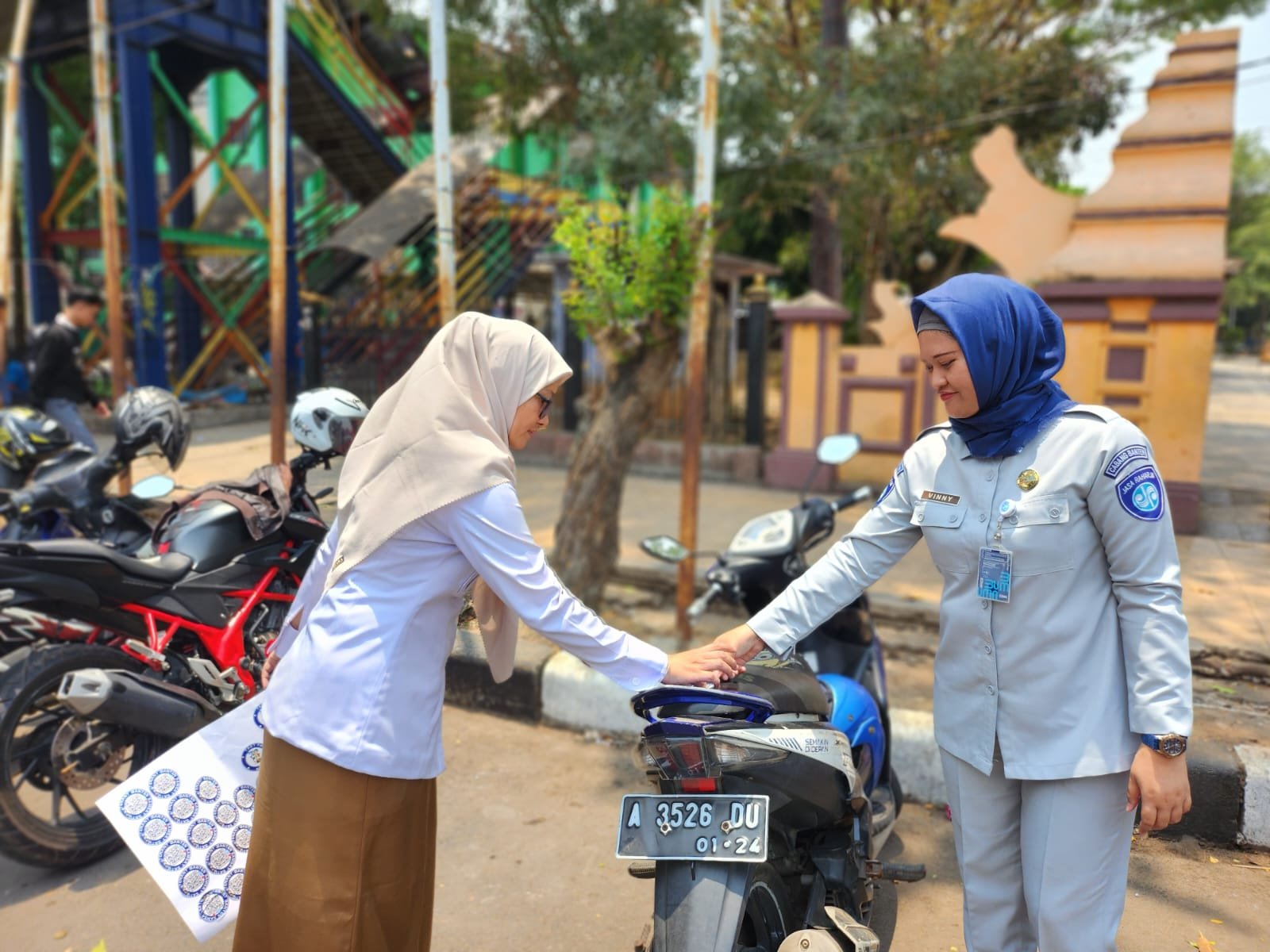 Tim Samsat Kota Serang Membagikan Stiker Pengingat Bayar Pajak Kendaraan dan Stiker Barcode Tebass.id