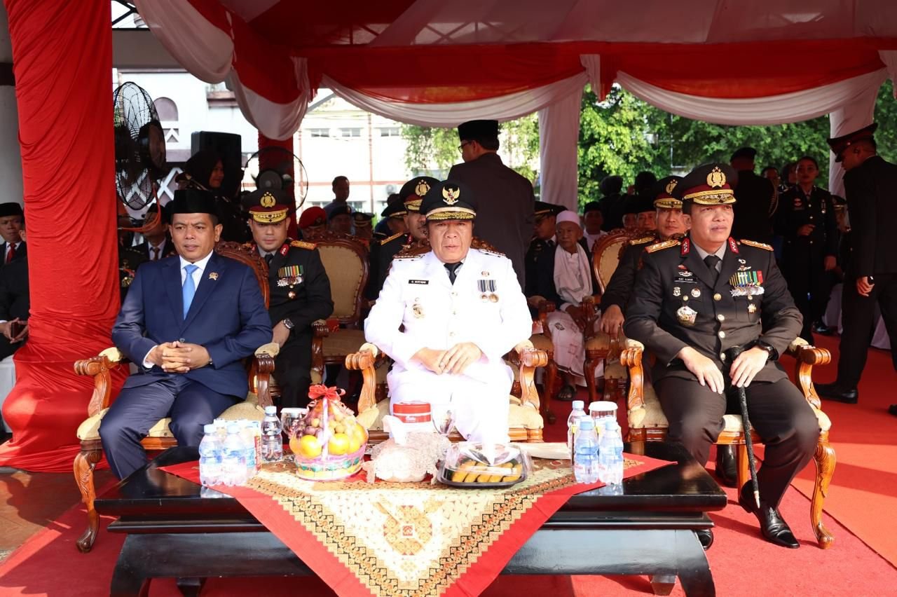 Serang, Sundapost.co.id – Penjabat (Pj) Gubernur Banten Al Muktabar, mengikuti Upacara Peringatan Hari Bhayangkara ke-78 Tahun 2024 di Alun-alun Kota Serang, Senin (1/7/2024). Upacara dipimpin oleh Kepala Kepolisian Daerah Banten Irjen Pol Abdul Karim.