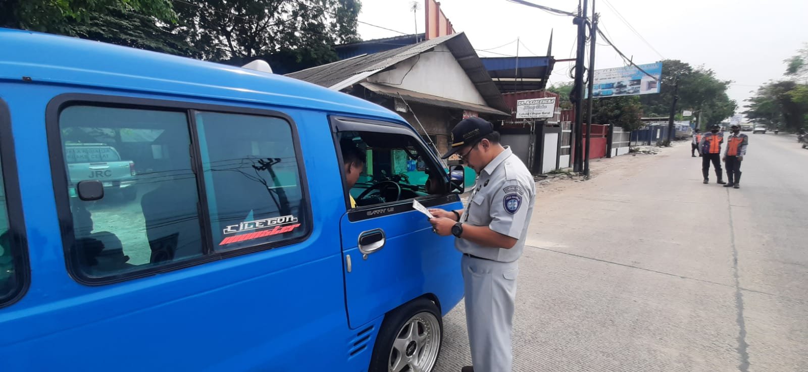 Serang, Petugas Jasa Raharja Samsat Gerai Ramanuju Cilegon Dede Nurul Hadi Bersama Dinas Perhubungan dan Polda Banten melaksanakan kegiatan Razia Pajak Kendaraan Bermotor Plat Kuning yang bertempat di Jl. Raya Serang Cilegon Kec. Kramawatu Kab. Serang Provinsi Banten, Kamis (23/11/2023).