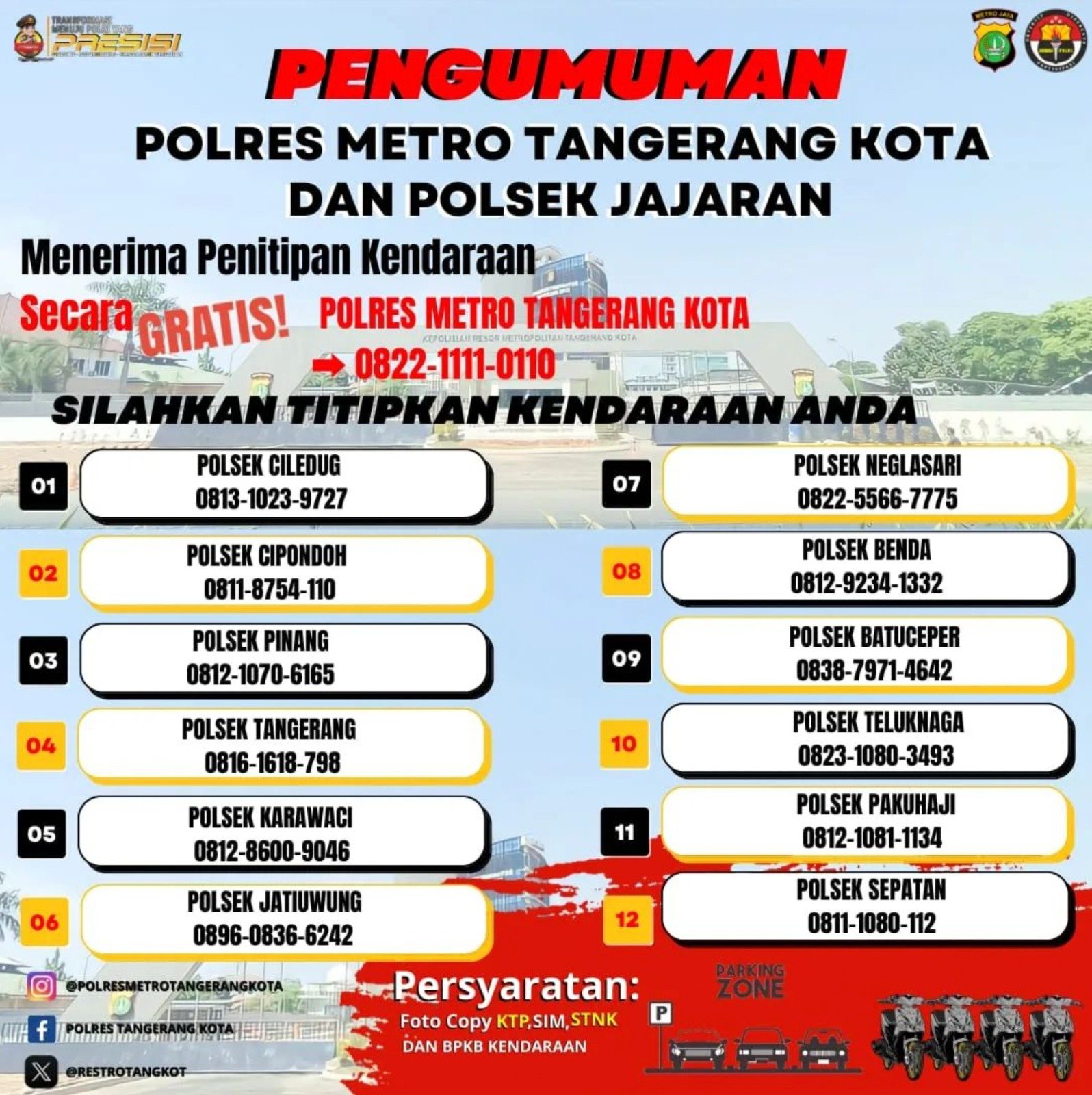 Sundapost.co.id – Polres Metro Tangerang Kota terus meningkatkan pelayanan menjelang musim Lebaran. Terkini, Polres Metro Tangerang Kota membuka layanan penitipan kendaraan bermotor yang bisa dimanfaatkan masyarakat selama musim mudik Lebaran 1445 H secara gratis.