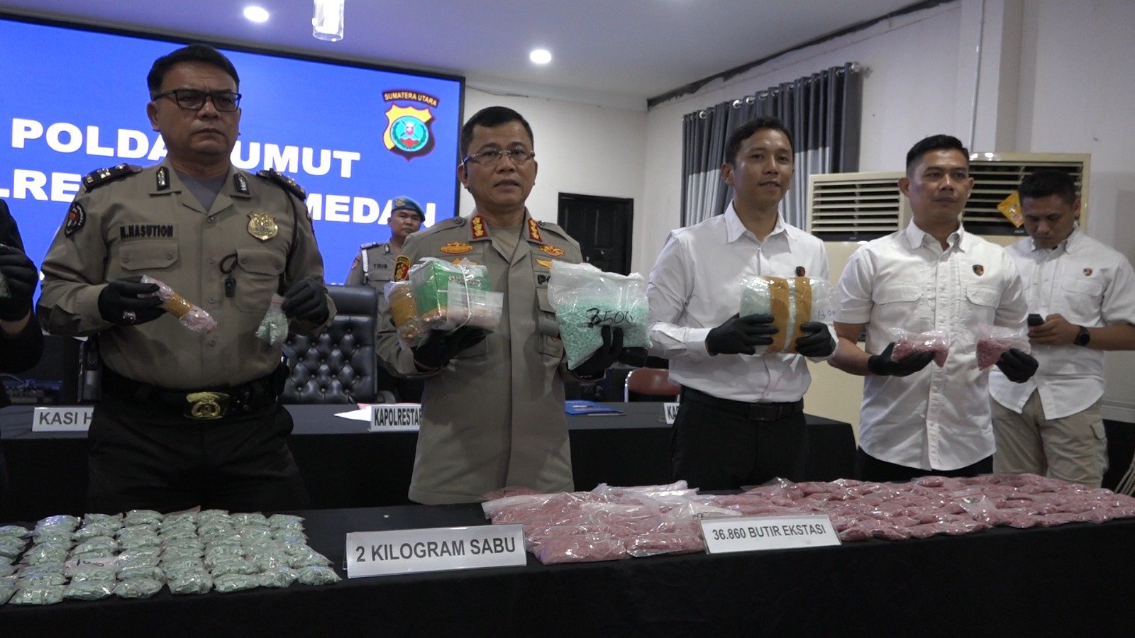 Lanjutnya lagi, Awalnya kita mendapatkan informasi perihal transaksi narkotika jenis sabu, namun setelah dilakukan penggerebekan, ternyata di dalam rumah kita temukan narkotika jenis pil ekstasi sebabyak 36.860 butir pil ekstasi dan selain pil ekstasi tersebut, kita juga temukan beberapa tas yang berisi 2 kilogram sabu, ungkap Teddy.