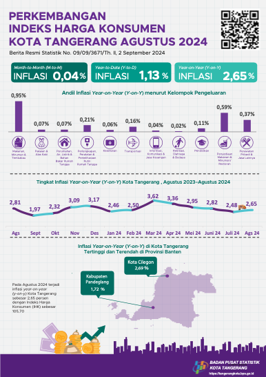 Asisten Daerah Bidang Ekonomi dan Pembangunan Kota Tangerang Ruta Ireng Wicaksono menuturkan, berdasarkan data yang dirilis Badan Pusat Statistik (BPS) Kota Tangerang, indeks inflasi pada Agustus 2024 mengalami sedikit kenaikan dari bulan sebelumnya.