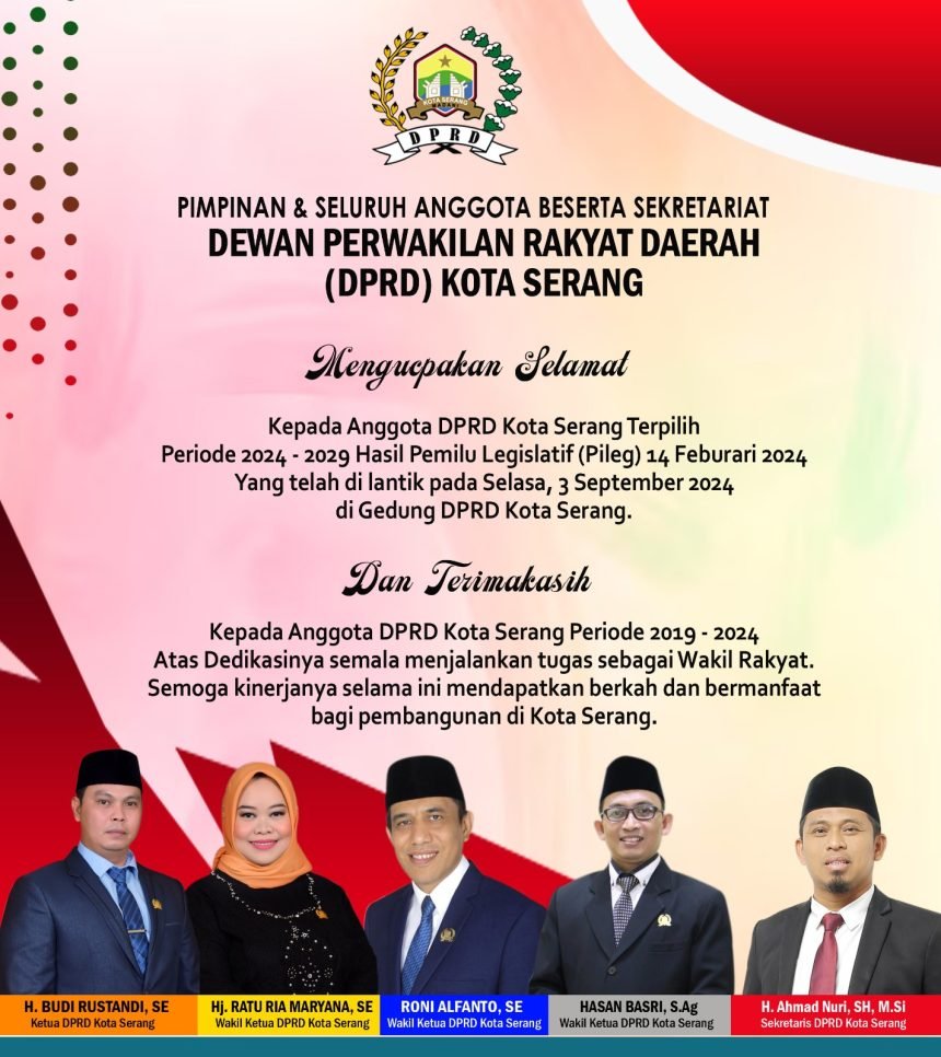 Pimpinan dan Seluruh Anggota Beserta Sekretariat DPRD Kota Serang Mengucapkan Selamat atas Pelantikan DPRD Kota Serang Masa Bakti 2024-2029 dan terimakasih kepada Anggota DPRD Kota Serang masa bakti 2019-2024.