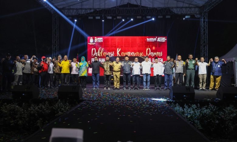 Serang, Sundapost.co.id – Penjabat (Pj) Gubernur Banten Al Muktabar menghadiri Deklarasi Kampanye Damai yang digelar oleh Komisi Pemilihan Umum (KPU) Provinsi Banten di Halaman Masjid Raya Al-Bantani, KP3B Curug, Kota Serang, Selasa (24/9/2024) malam. Kampanye dengan pesan yang baik, positif, dan damai.