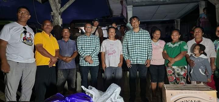 Tino dan Onasis menyerahkan bantuan berupa selimut, sirih, ikan, mintak goreng, beras, dan sembako lainnya.