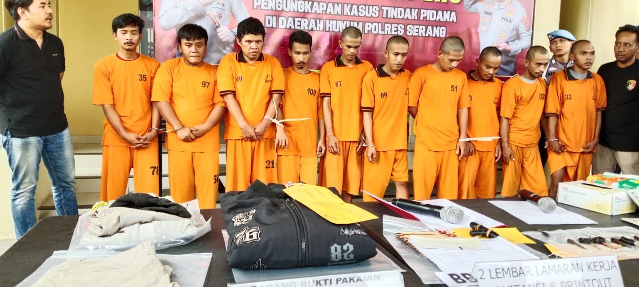 “Kesepuluh tersangka ini diamankan dalam 10 hari kerja. Lima diantaranya terpaksa dilakukan tindakan tegas dan terukur karena mereka melakukan tindakan yang membahayakan petugas,” kata Kapolres Serang AKBP Condro Sasongko dalam konferensi pres di Mapolres Serang, Kamis 24 Oktober 2024.