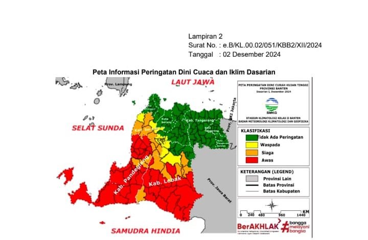 SERANG, Sundapost.co.id – Badan Metereologi, Klimatologi dan Geofisika (BMKG) Balai Besar Wilayah II merilis sejumlah daerah dengan peringatan dini curah hujan tinggi serta potensi banjir rob di Banten pada Desember 2024.