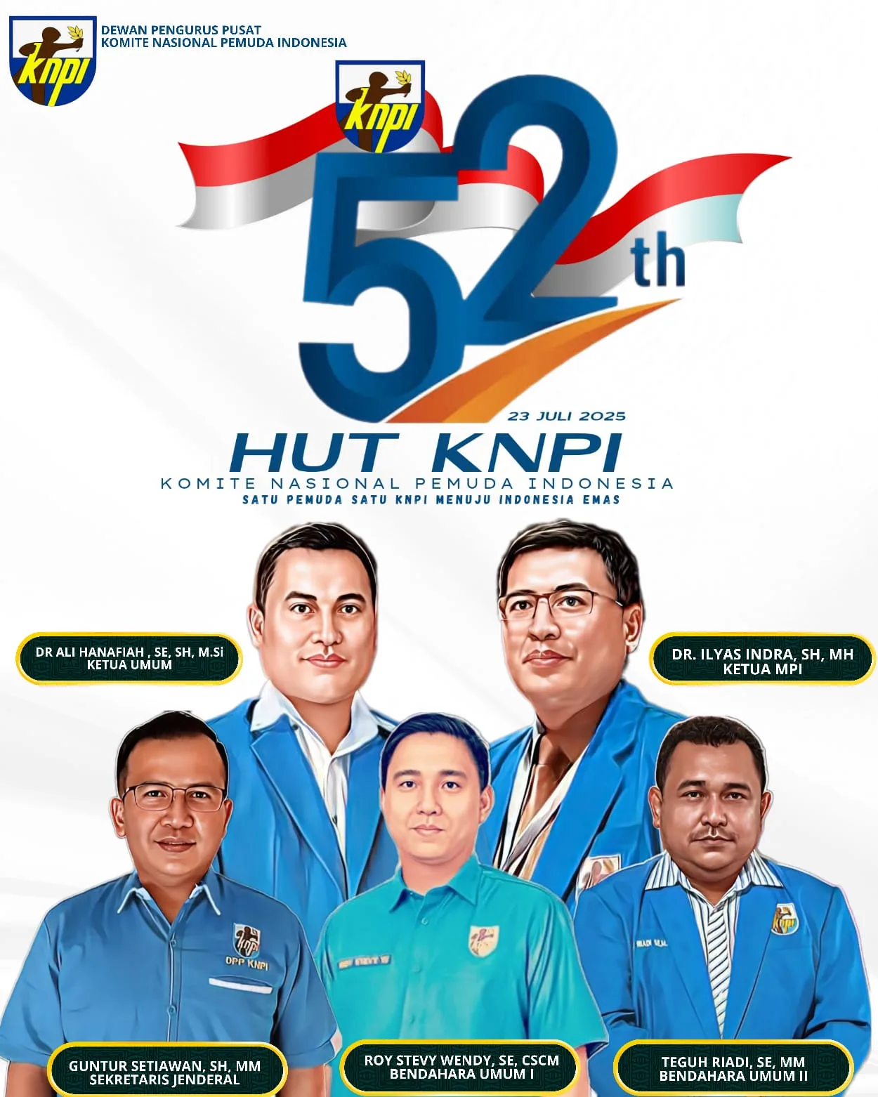 Perayaan HUT KNPI Ke-52 Tahun 2025 akan dilaksanakan di Gedung Pemuda/ Gedung DPP KNPI Rasuna Said Jakarta pada tanggal 23 Juli 2025.