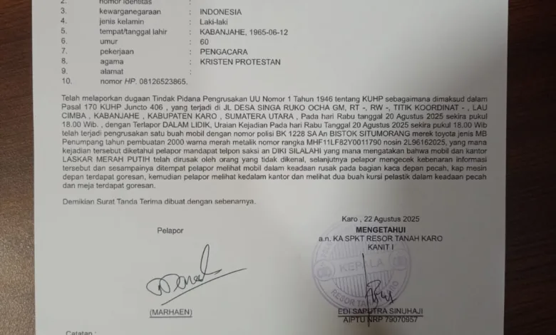 Menyikapi Aksi penyerangan ini, Marhen Sinulaki Direktur LBH MACAB Laskar Merah putih Kabupaten Karo, membuat laporan pengaduan ke Polres Tanah Karo, berdasarkan Laporan Polisi Nomor : LP/B/381/VIII/2025/SPKT/POLRES TANAH KARO/POLDA SUMATERA UTARA , tanggal 22 Agustus 2025 pukul 19.40 WIB, bertempat di kantor kepolisian Polres Tanah Karo.