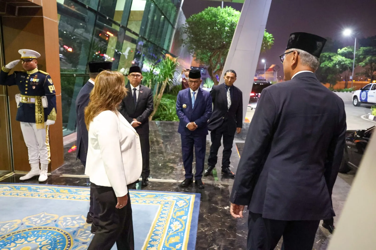 Di Indonesia, agenda resmi Presiden Dina Boluarte antara lain melakukan pertemuan resmi bersama Presiden Republik Indonesia Prabowo Subianto di Istana Merdeka dan bertemu dengan Ketua DPR RI Puan Maharani di Gedung DPR RI, Jakarta. (Ms)