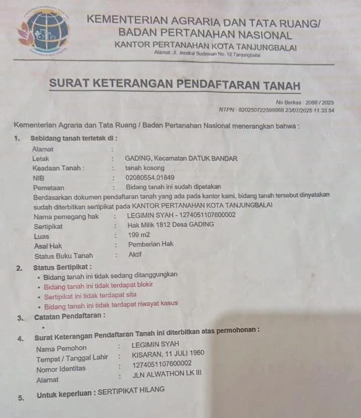 Surat Tanah Atas Nama Legimin Syah Telah Hilang ,Sudah Dilaporkan ke Kantor Pertanahan Kota Tanjung Balai
