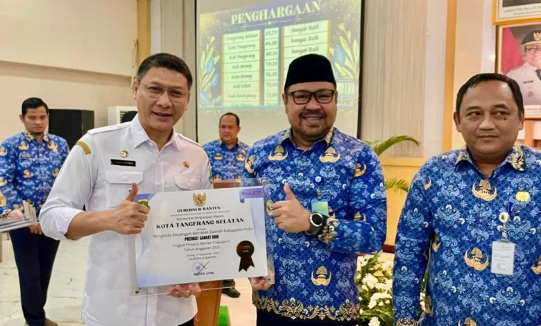 Penghargaan diserahkan Sekretaris Daerah (Sekda) Banten, Deden Apriandhi dan diterima oleh Sekretaris Badan Keuangan dan Aset Daerah (BKAD) Kota Tangsel, Billy, pada Rabu (17/09/2025).