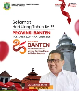 Dinas Pendidikan dan Kebudayaan Provinsi Banten mengucapkan Dirgahayu Provinsi Banten ke 25 Tahun, 4 Oktober 2000 – 4 Oktober 2025. “Kolaborasi Kuatuntuk Banten Maju, Adil dan Merata”.