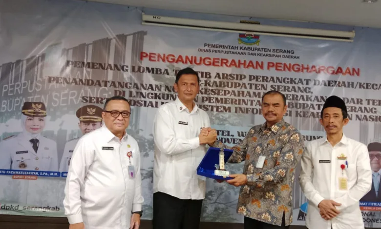 SERANG – Pemerintah Kabupaten (Pemkab) Serang terus memperkuat komitmen dalam meningkatkan tata kelola kearsipan di seluruh perangkat daerah hingga tingkat kecamatan dan desa. Hal tersebut ditegaskan dalam agenda Penganugerahan Penghargaan Tertib Arsip serta penandatanganan nota kesepahaman gerakan sadar tertib arsip yang digelar Dinas Perpustakaan dan Kearsipan Daerah (DPKD) Kabupaten Serang.