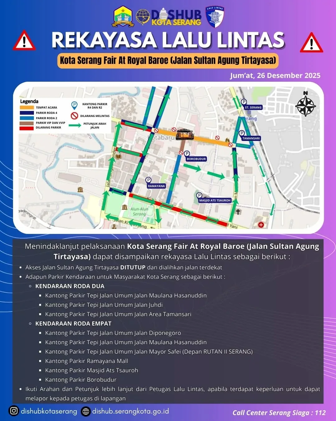 SERANG – Dinas Perhubungan (Dishub) Kota Serang menerapkan rekayasa lalu lintas dan penutupan Jalan Sultan Agung Tirtayasa seiring pelaksanaan Kota Serang Fair 2025 yang digelar di Royal Baroe, Kota Serang. Rekayasa lalu lintas mulai diberlakukan sejak Kamis, 25 Desember 2025 pukul 12.00 WIB hingga Sabtu, 27 Desember 2025 pukul 05.00 WIB.