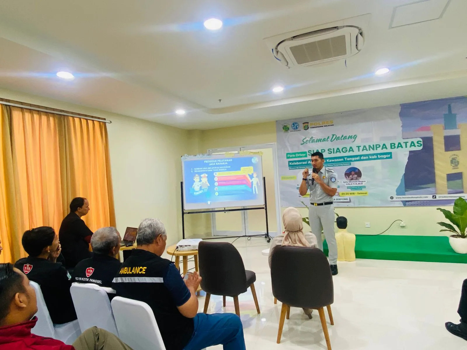 TANGERANG – Menjelang tutup tahun 2025 PT Jasa Raharja bersinergi dengan Polres Tangerang Selatan, komunitas ojek online (OJOL), tim ambulans, dan RS Hermina Serpong mengadakan kegiatan Sosialisasi dan Pelatihan Pertolongan Pertama Gawat Darurat (PPGD) di Lantai 3 Gedung RS Hermina Serpong. Kegiatan ini diselenggarakan pada tangal 24 Desember 2025 dan dihadiri oleh berbagai unsur masyarakat dan instansi.