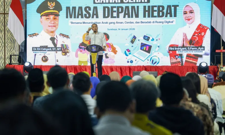 Surabaya,Sundapost.co.id – Pemerintah Kota (Pemkot) Surabaya menggelar sosialisasi Surat Edaran (SE) Wali Kota Surabaya Nomor 400.2.4/34733/436.7.8/2025 tentang Penggunaan Gawai (HP) dan Internet untuk Anak di Kota Surabaya. Kegiatan ini berlangsung di Convention Hall Surabaya, Rabu (14/1/2026), dengan menghadirkan sejumlah narasumber strategis, mulai dari Densus 88, Badan Narkotika Nasional (BNN), Forum Satu Data, hingga Polrestabes Surabaya.