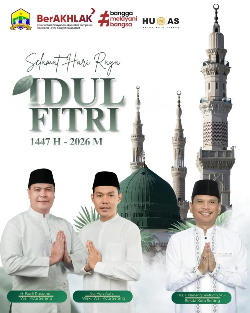 Pemerintah Kota Serang mengucapkan Selamat Hari Raya Idul Fitri 1447 H/2026 M. Taqaballahu Minna Wa Minkum “Mohon Maaf Lahir & Batin”