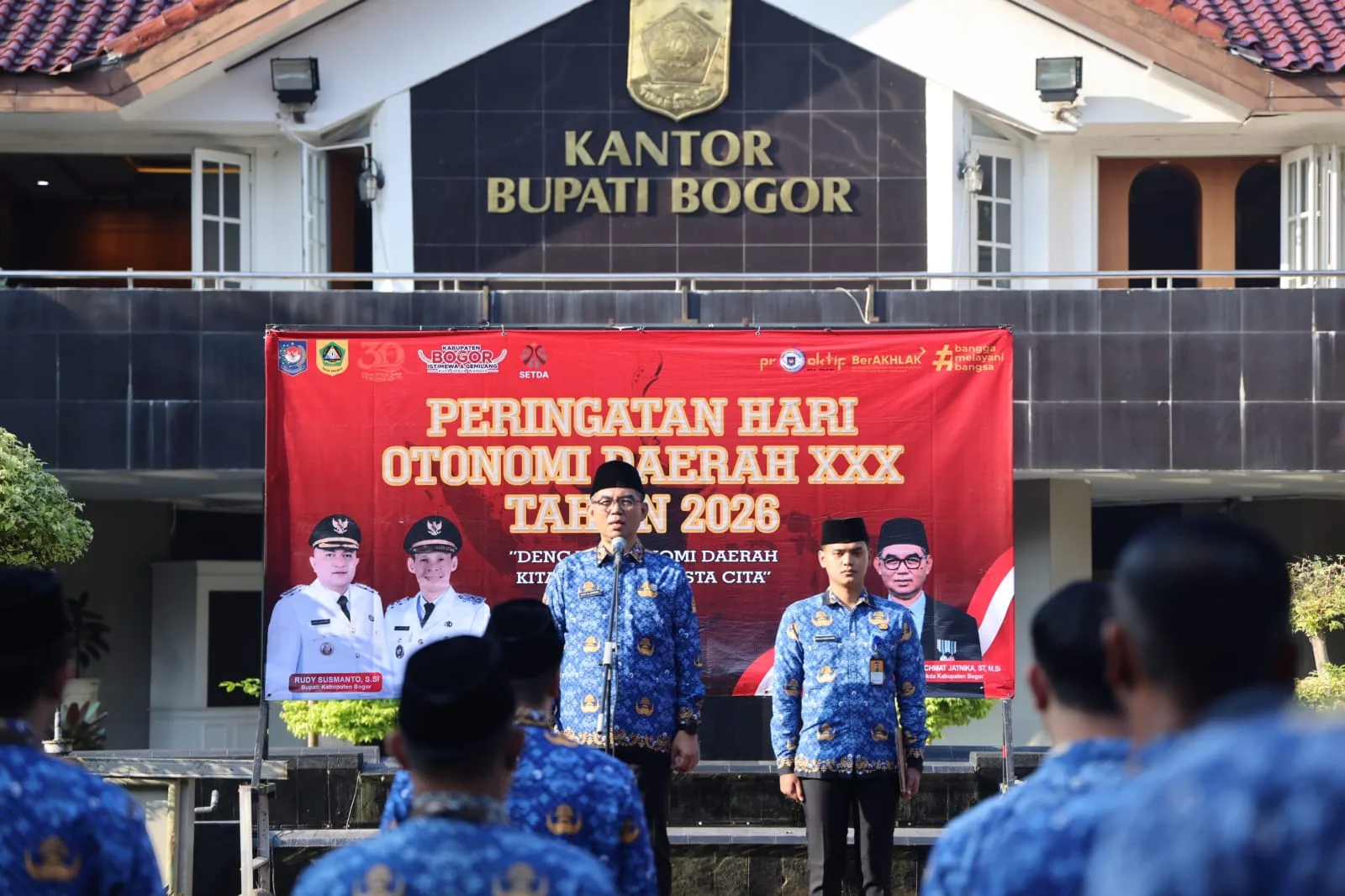 CIBINONG, Sundapost.co.id – Sekretaris Daerah (Sekda) Kabupaten Bogor, Ajat Rochmat Jatnika memimpin Upacara Peringatan Hari Otonomi Daerah ke-30 Tahun 2026. Upacara berlangsung di Halaman Kantor Sekretariat Daerah, Cibinong, Senin (27/4). Peringatan Hari Otonomi Daerah merupakan momentum untuk memperkokoh sinergi, komitmen, dan peran pemerintah daerah dan pusat dalam memberikan manfaat nyata bagi masyarakat.
