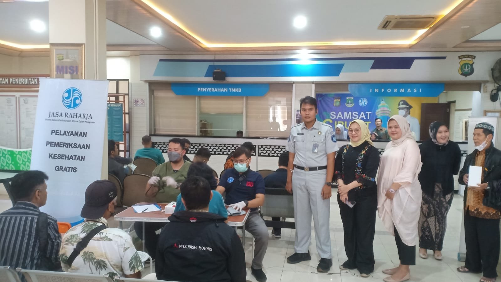 Tangerang – PT Jasa Raharja Perwakilan Tangerang Cabang Banten bekerjasama dengan UPTD PPD Samsat Ciputat mengadakan kegiatan pengobatan gratis bagi para wajib pajak di Samsat Ciputat, Kamis (05/10/2023). Kegiatan ini dilaksanakan sebagai wujud kepedulian Jasa Raharja terhadap kesehatan para wajib pajak, pegawai samsat dan masyarakat sekitar samsat.