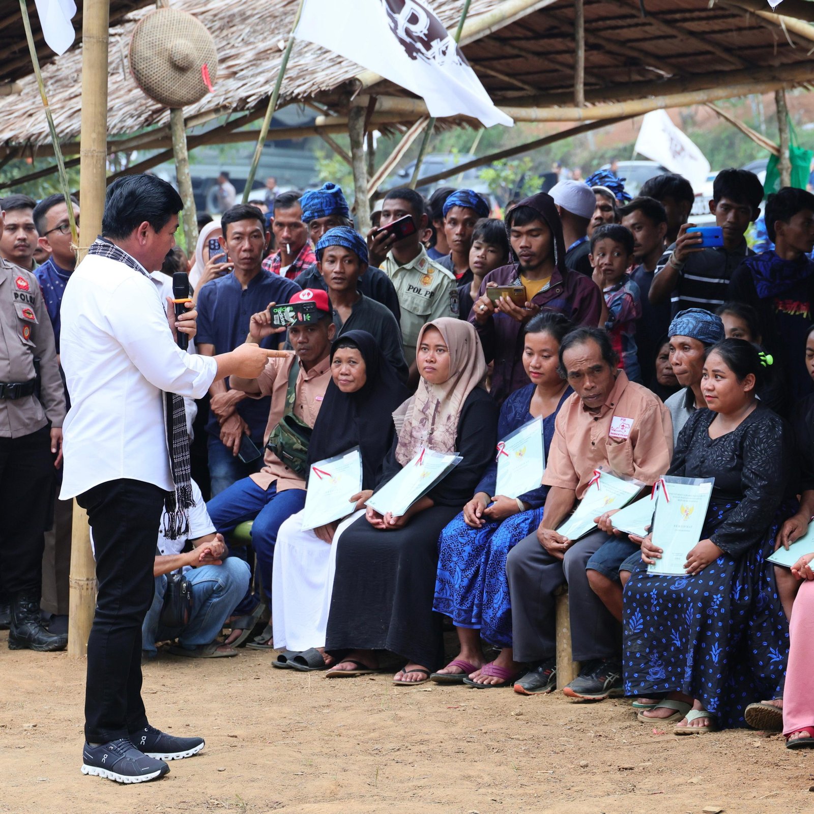 Lebak, Sundapost.co.id – Menteri Agraria dan Tata Ruang/Kepala Badan Pertanahan Nasional (ATR/BPN), Hadi Tjahjanto menyerahkan 12 sertipikat yang diperuntukkan untuk 195 warga di Gunung Anten, Kabupaten Lebak, Banten, pada Jumat (27/10/2023). Sertipikat tersebut merupakan hasil dari program Reforma Agraria.